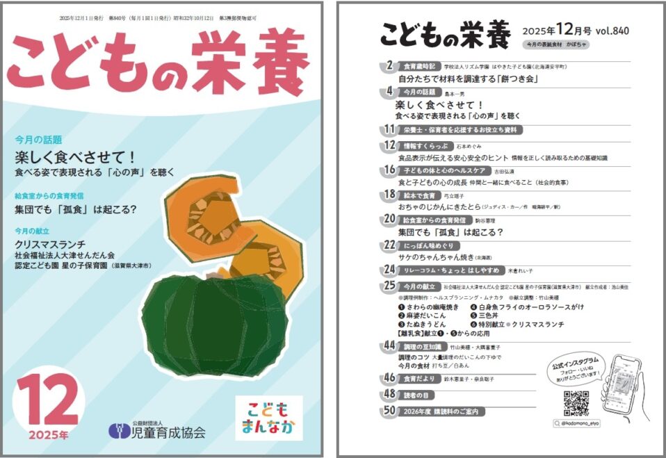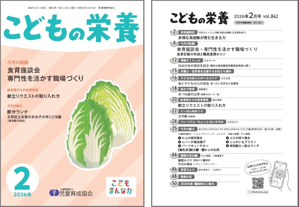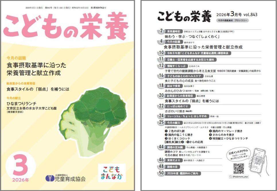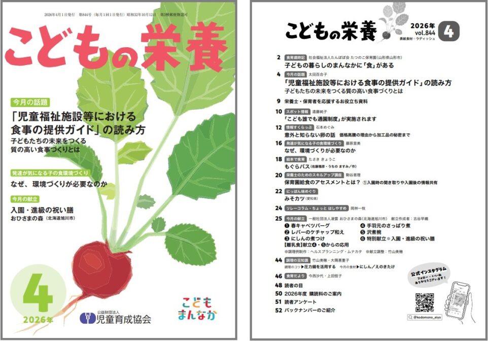保育所など、児童福祉施設の給食に関する専門誌です。 保育所での食育実践に役立つ資料として、様々な情報をお届けしています。